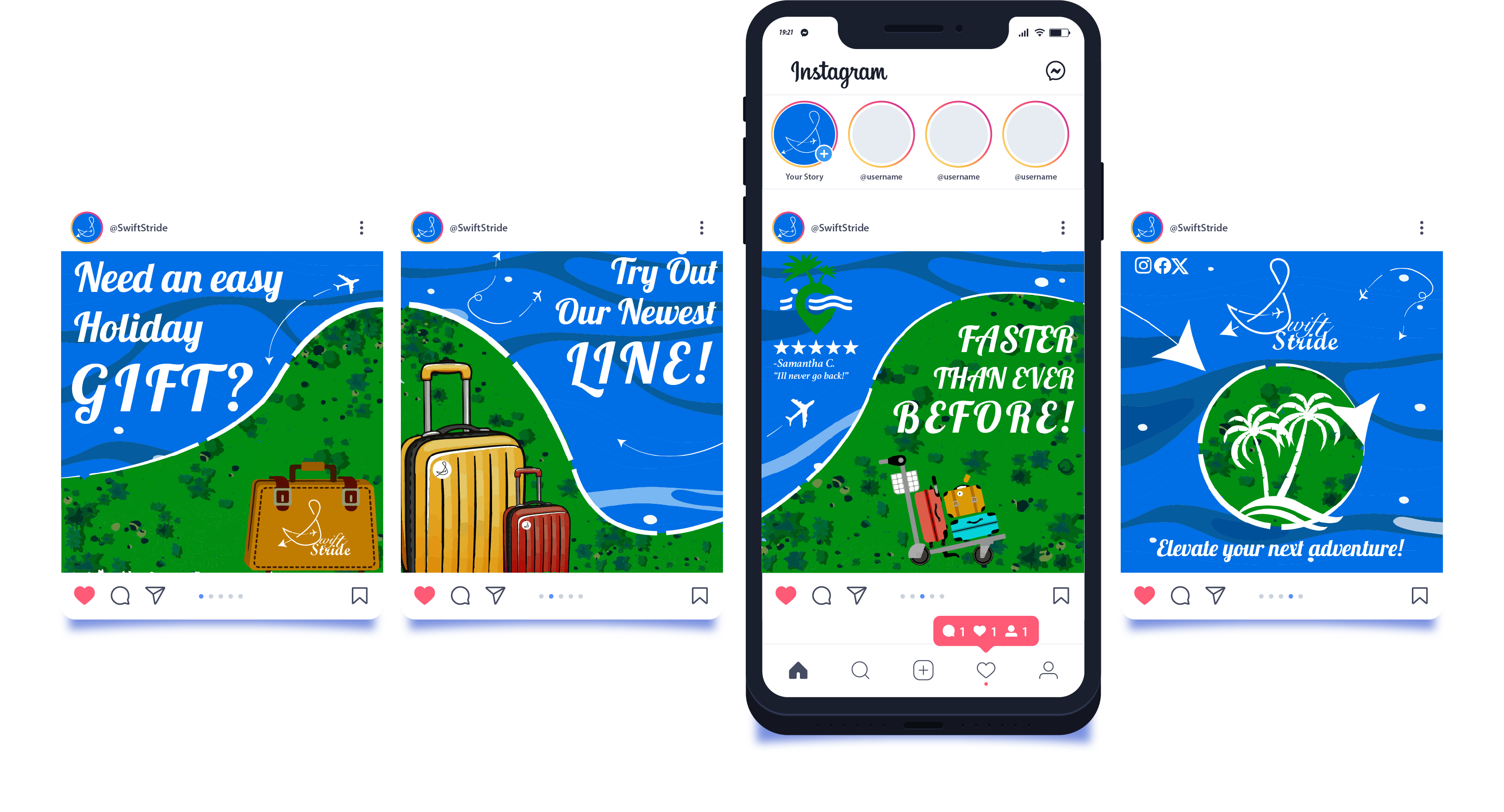 This project was developed as part of a college design assignment with a fast-paced timeline, challenging me to quickly conceptualize and execute a strong, original brand identity. Working under a tight deadline required efficient ideation, clear visual direction, and intentional design choices that could communicate the brand’s message at a glance!Swift Stride takes luggage beyond function and turns it into a statement. Inspired by movement, speed, and the experience of flying, the brand introduces a dynamic new vision of travel gear. Designed to catch the eye and spark curiosity, Swift Stride invites travelers to see their luggage not just as something they carry, but as part of their journey through the skies!