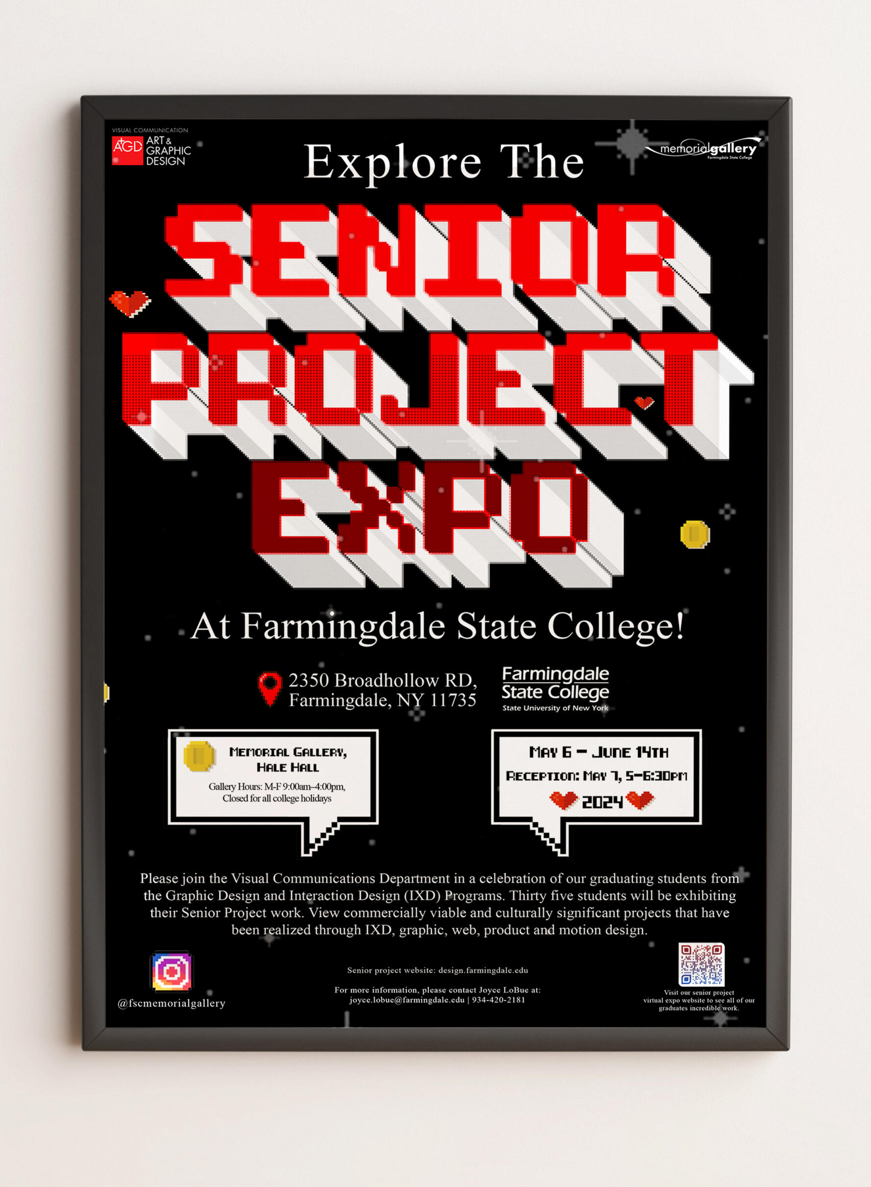 This poster was created for the 2025 Senior Project Expo for the Visual Communications Department at Farmingdale State College as part of a student design competition. Senior designers were challenged to develop a new and exciting visual style that would redefine the annual event and capture the creativity of the graduating class. My design focused on creating a bold, engaging presence that reflects both innovation and professionalism, aiming to attract attendees while celebrating student work. The poster received 2nd place in the competition, falling short by just one vote, with voting open to both students and faculty, highlighting its strong reception across the department!