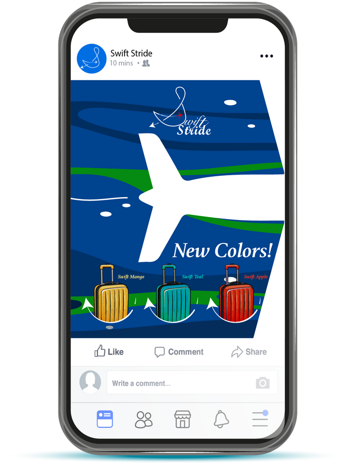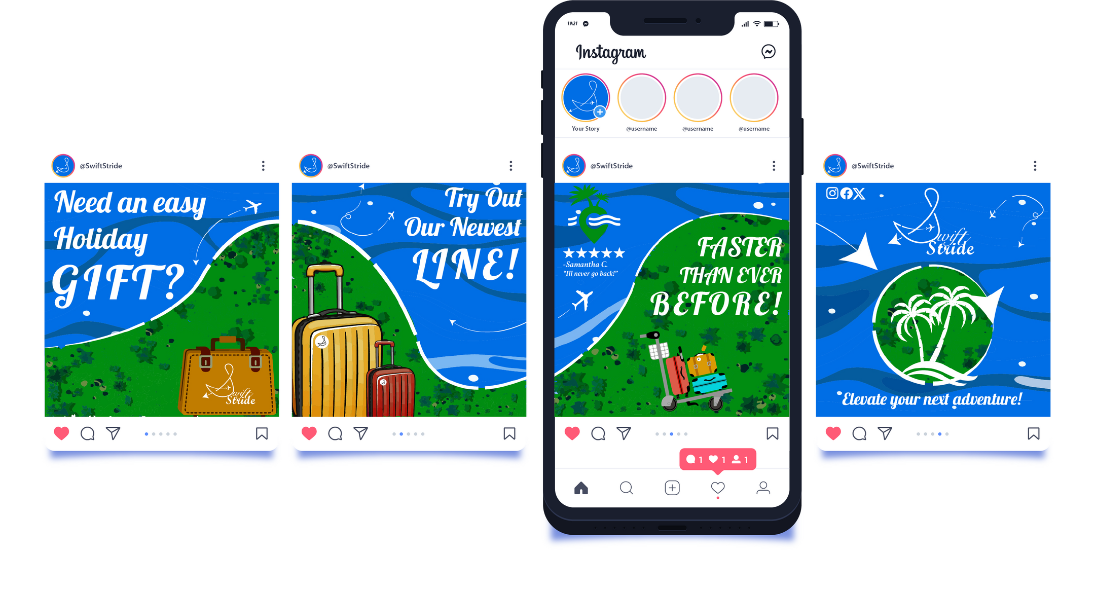 This project was developed as part of a college design assignment with a fast-paced timeline, challenging me to quickly conceptualize and execute a strong, original brand identity. Working under a tight deadline required efficient ideation, clear visual direction, and intentional design choices that could communicate the brand’s message at a glance!Swift Stride takes luggage beyond function and turns it into a statement. Inspired by movement, speed, and the experience of flying, the brand introduces a dynamic new vision of travel gear. Designed to catch the eye and spark curiosity, Swift Stride invites travelers to see their luggage not just as something they carry, but as part of their journey through the skies!